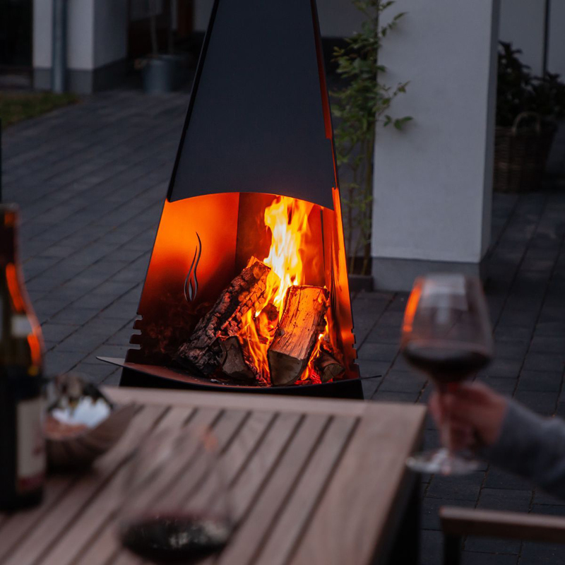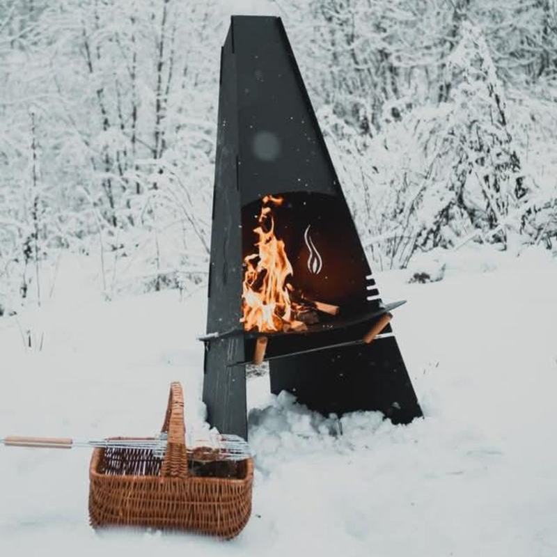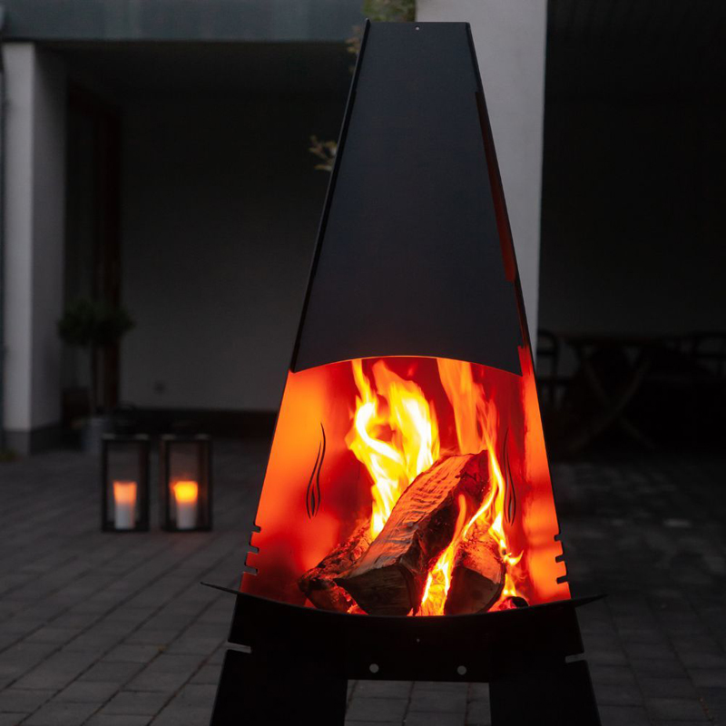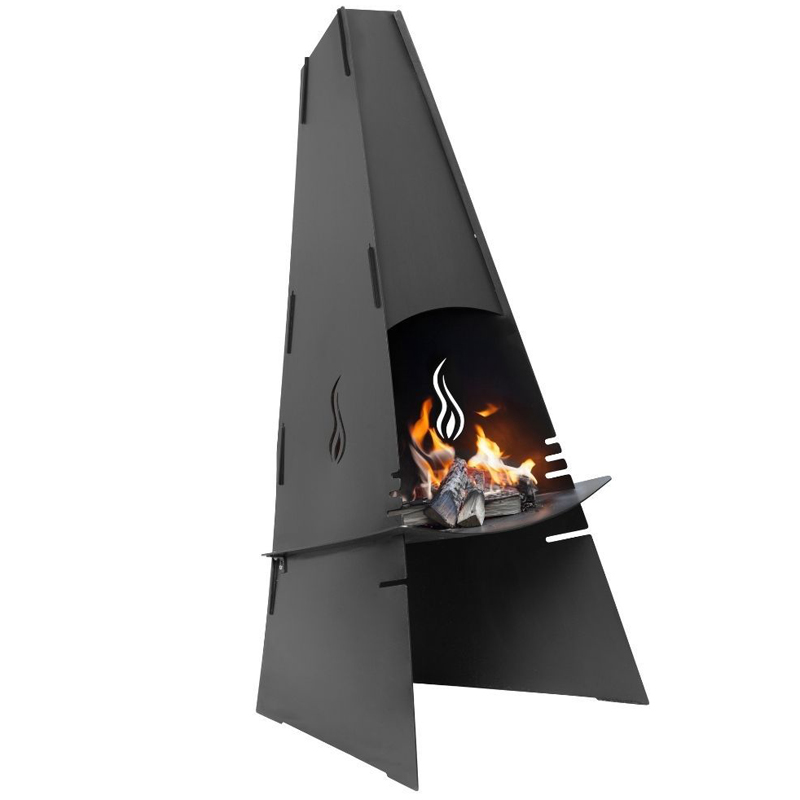 Met een hoogte van 124 cm en een breedte van 60 cm biedt de haard voldoende ruimte voor een krachtig vuur, terwijl het compacte ontwerp hem geschikt maakt voor verschillende soorten buitenopstellingen. Het zwarte staal is hittebestendig en bestand tegen wisselende weersomstandigheden, waardoor deze buitenhaard niet alleen functioneel is, maar ook duurzaam.