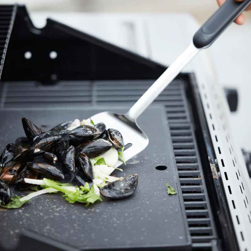 Dankzij de lange lengte van 38 cm werk je op veilige afstand van de hitte, terwijl het brede blad je volledige controle geeft bij het draaien van burgers, vis of groenteschijven. De spatel is stevig, betrouwbaar en eenvoudig schoon te maken – perfect voor elke barbecuefan.