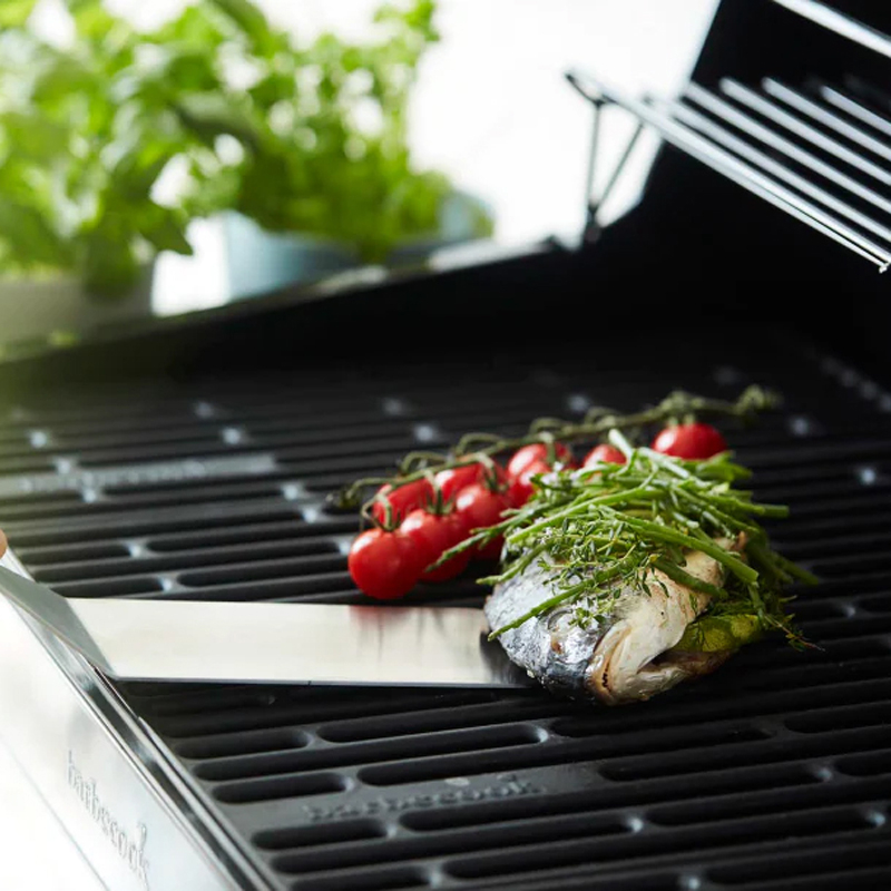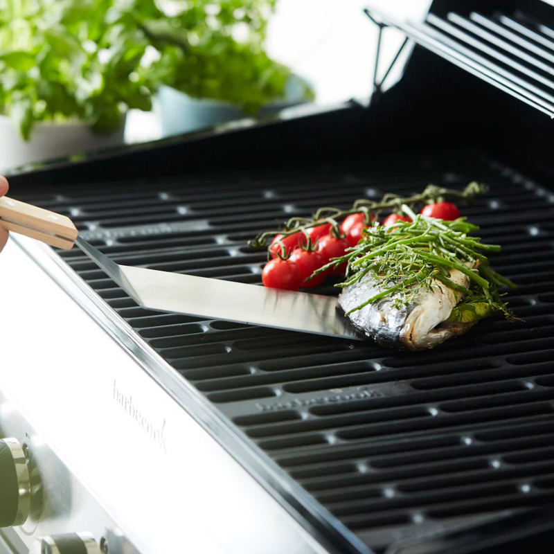 Met de Barbecook visspatel uit RVS en hout draait en serveert u vis eenvoudig en voorzichtig. Dankzij het brede blad en het comfortabele handvat werkt u efficiënt en met zorg – essentieel voor elke visliefhebber aan de barbecue.