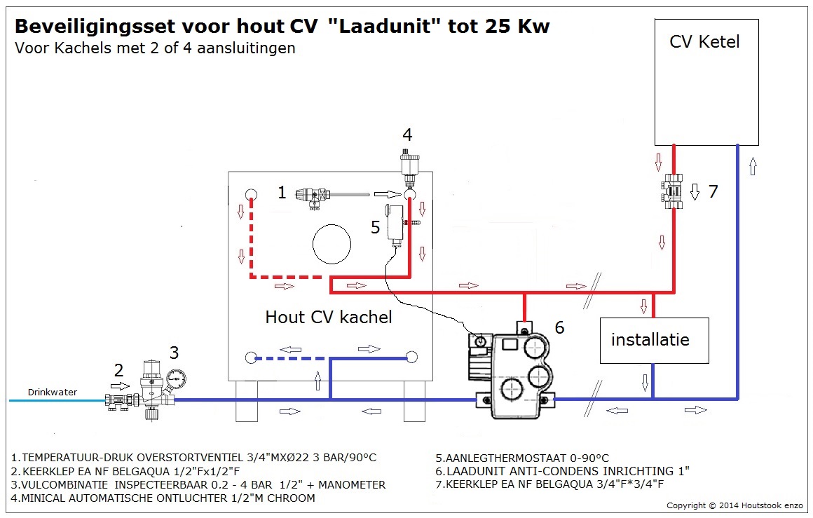 Deze moet in de de aanvoerleiding van de bestaande CV ketel met de pijl in de stromingsrichting gemonteerd worden. Deze voorkomt dat de pomp van de Hout-CV door de CV-ketel circuleert.