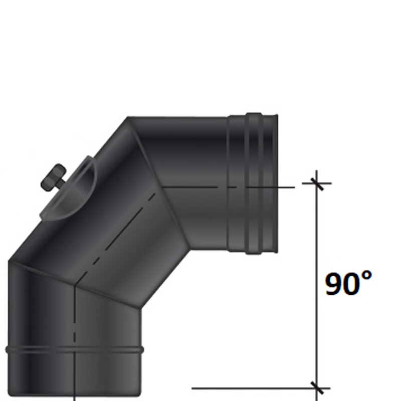 De Bocht 90° met inspectieluik – Ø125 mm – Enkelwandig geëmailleerd staal maakt het mogelijk om een rookgasafvoer in een rechte hoek te leiden en biedt tegelijkertijd toegang tot het kanaal voor onderhoud. Het geëmailleerde staal is hittebestendig en heeft een gladde afwerking.
