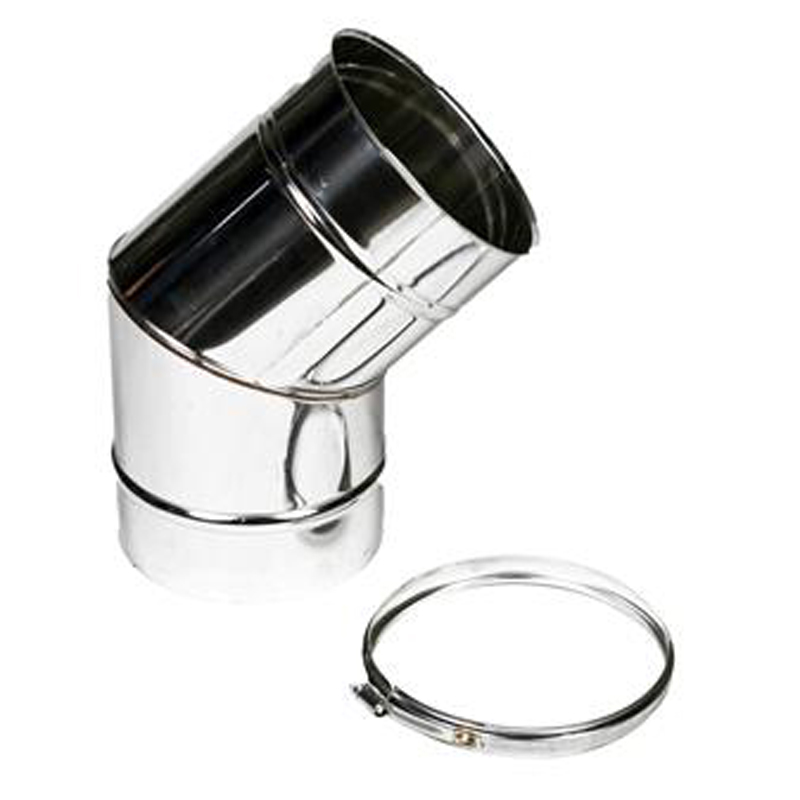 De Bocht Ø150 mm – 45° – Enkelwandig RVS is ideaal voor het aanpassen van de richting van je rookgasafvoer onder een hoek van 45 graden. Deze hoek biedt een goede balans tussen richtingsaanpassing en behoud van een optimale trek.