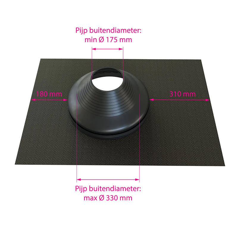 De Flexibele dakdoorvoer dakhelling 0–45° EPDM-Aluminium – Loodvervanger 175–330 mm – zwart is een betrouwbare keuze voor het afdichten van rookgasafvoeren op schuine daken. De combinatie van elastisch EPDM en een grote aluminium onderplaat maakt deze doorvoer geschikt voor grote buitendiameters en uiteenlopende profielvormen. Deze uitvoering is bovendien loodvrij, wat hem milieuvriendelijker maakt zonder in te boeten op prestaties.