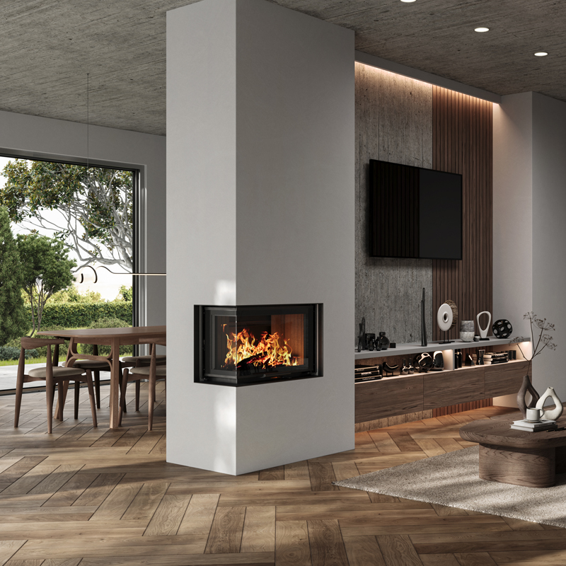 De inbouw houtkachel Elite 3-zijdig is een moderne haard die elegantie en functionaliteit samenbrengt in één krachtig ontwerp. Dankzij het driezijdige vuurzicht geniet u vanuit meerdere hoeken van het vlammenspel, waardoor een warme en uitnodigende sfeer ontstaat in uw leefruimte. Het brede glasoppervlak en het minimalistische kader zorgen voor een panoramisch zicht op het vuur, dat zowel overdag als ’s avonds een echte blikvanger is. Door de compacte inbouwdiepte is deze haard ook geschikt voor kleinere ruimtes of voor situaties waarin een subtiele, strakke integratie gewenst is.