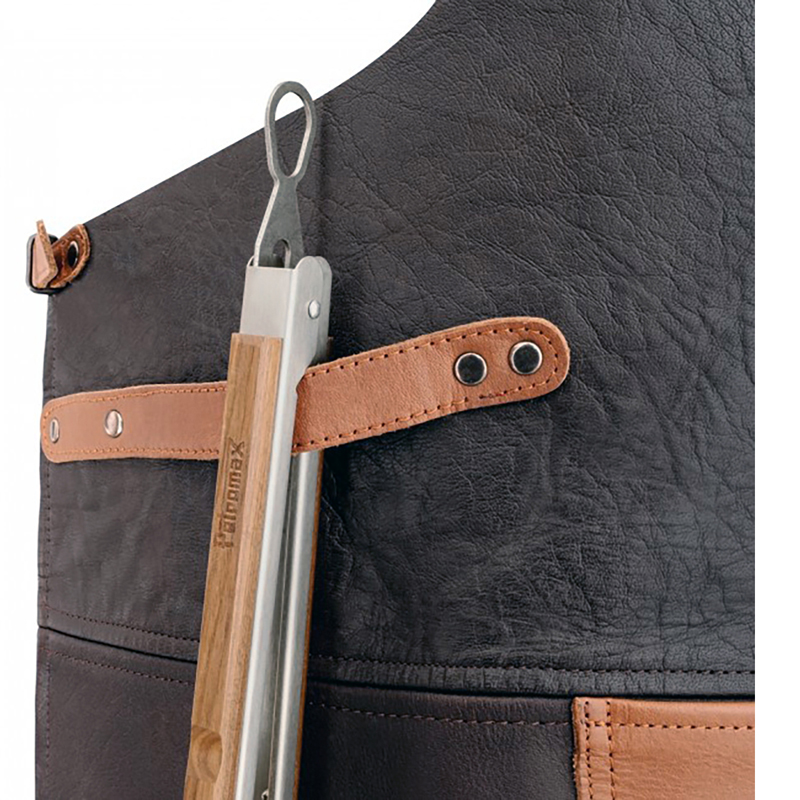 De verstelbare nekband en tailleband zorgen voor een perfecte pasvorm, ongeacht uw lichaamsbouw. Het schort is uitgerust met een praktische borstzak, een ruim heuptasje en een handige riem aan de zijkant voor het ophangen van accessoires zoals handdoeken of gereedschap. De combinatie van donkerbruin leer met cognackleurige accenten geeft het schort een tijdloze en professionele uitstraling.