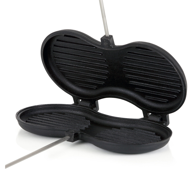 De lange, vlakke houten handgrepen bieden een comfortabele grip en houden je handen op veilige afstand van de hitte. Een stevige vergrendelhaak houdt het ijzer gesloten tijdens het koken, zodat je hamburgers gelijkmatig garen zonder te verschuiven.