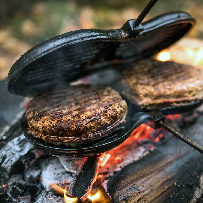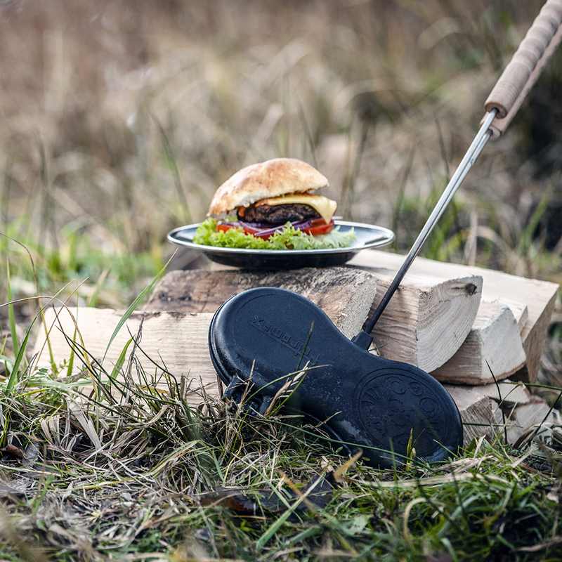 Het Petromax Gietijzeren Hamburgerijzer bereid moeiteloos twee hamburgers tegelijkertijd boven een kampvuur of barbecue. Het geribbelde binnenoppervlak zorgt voor een aantrekkelijk grillpatroon en een knapperige buitenkant, terwijl het gietijzer de warmte gelijkmatig verdeelt voor een sappige binnenkant.