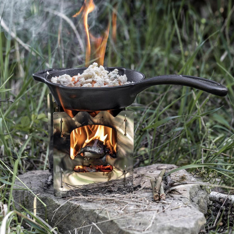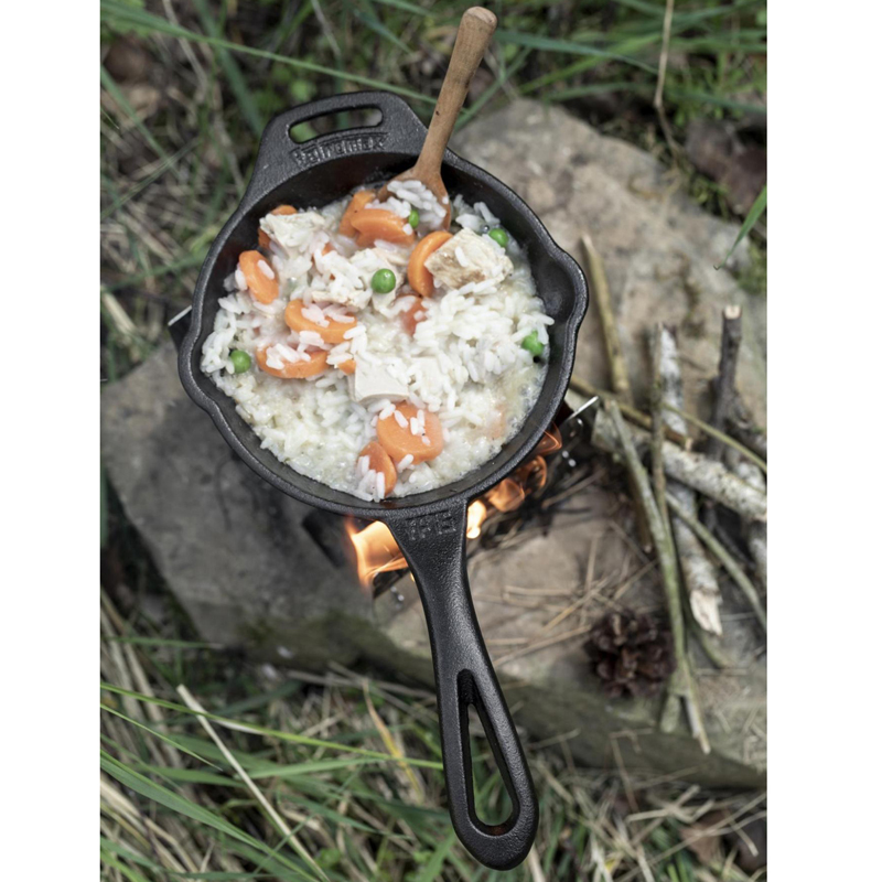 De pan is reeds ingebrand (seasoned finish) en klaar voor gebruik. Dankzij de schenktuiten aan beide zijden giet u vloeistoffen gemakkelijk af. De robuuste handgreep met ophangoog maakt deze skillet ook geschikt voor gebruik boven het kampvuur. Klein in formaat, groots in prestaties – een must-have voor elke buitenkookliefhebber.