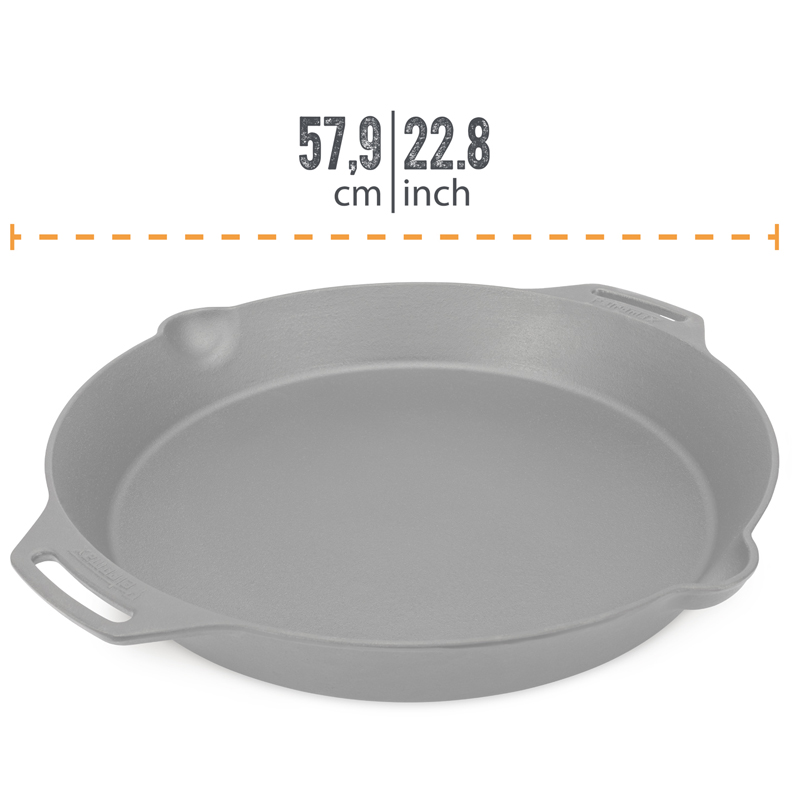 De stevige dubbele handvatten maken het verplaatsen van de zware pan veilig en stabiel, zelfs wanneer hij volledig is gevuld. Dankzij de schenktuiten aan beide zijden kunt u eenvoudig vloeistoffen afgieten. De pan is voorbehandeld en klaar voor gebruik, zodat u direct aan de slag kunt. Deze skillet is een absolute must voor evenementen, groepskoken of professioneel buitengebruik.