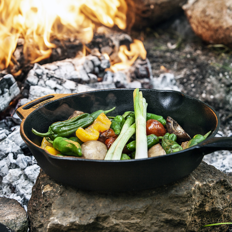 De pan is voorzien van een stevig handvat met ophangoog en schenktuiten aan beide zijden. Daardoor is hij gemakkelijk op te hangen en handig bij het afgieten van vet of vloeistof. De natuurlijke antiaanbaklaag maakt koken en schoonmaken eenvoudig. Voorzien van een ‘seasoned finish’ is hij direct klaar voor gebruik – een betrouwbare klassieker voor buiten én binnen.